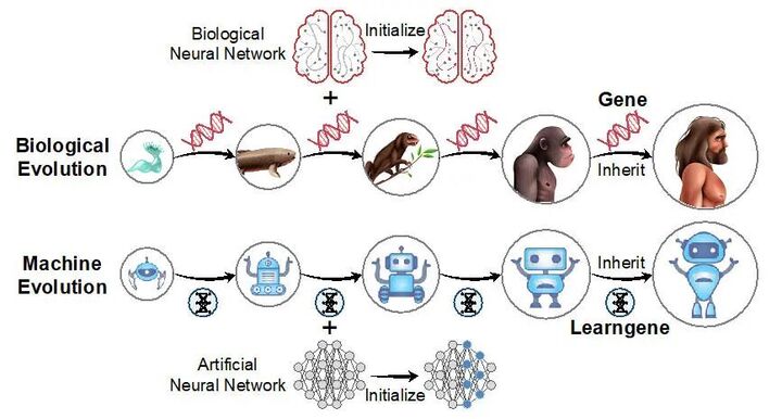 人工智能的發(fā)展一直深受生物智能的啟發(fā)。生物體通過基因在代際間傳遞知識,賦予后代先天能力,而現(xiàn)有的人工智能卻始終缺少類似的機(jī)制。人類和動物的大腦在出生時已被進(jìn)化了35億年的基因“藍(lán)圖”所初始化,而機(jī)器往往只能依賴海量數(shù)據(jù),從零開始進(jìn)行低效的學(xué)習(xí)。