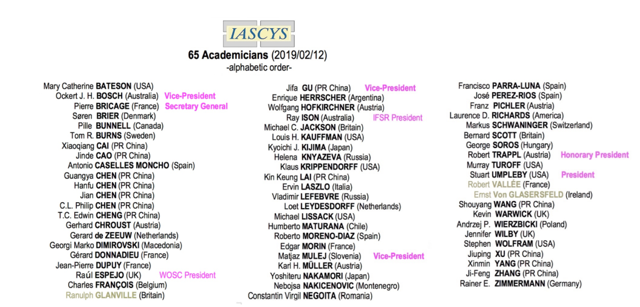 The International Academy for Systems and Cybernetic Sciences, headquartered in Vienna, Austria, is composed of 36 member countries and international societies. Its academicians are elected in accordance with 11 criteria, including academic achievements, publications, citations, and reputation in the academic field. An academician of the International Academy for Systems and Cybernetic Sciences is the highest academic honorary title in the field of system engineering. At present, the Academy has a total of 65 academicians.